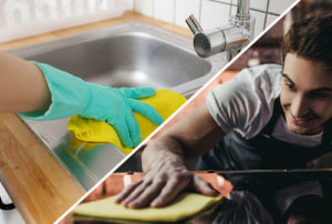We clean countertops, outer surfaces of cooking range, microwave, exterior of cabinets, refrigerator, and dishwasher. We clean and sanitize sink and faucet fixtures, sweep and mop the floor.